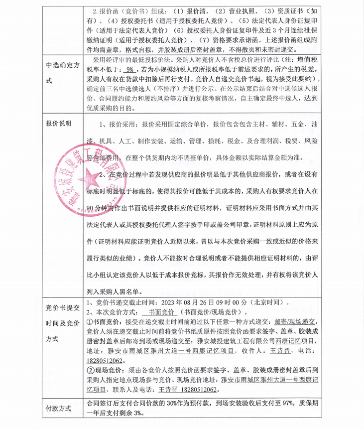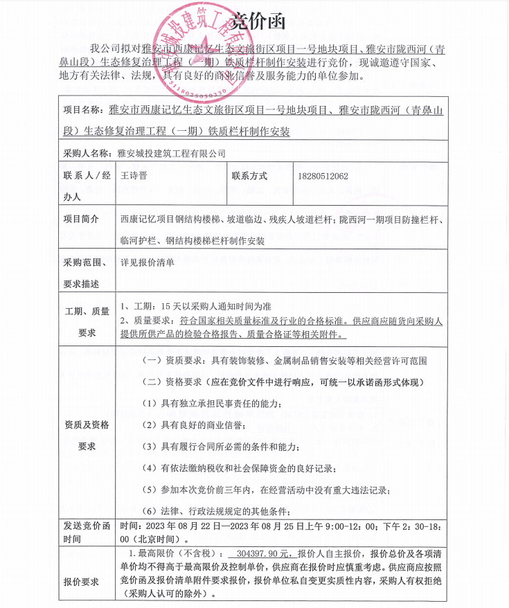 雅安市西康記憶生態(tài)文旅街區(qū)項(xiàng)目一號(hào)地塊項(xiàng)目、雅安市隴西河(青鼻山段)生態(tài)修復(fù)治理工程(一期)鐵質(zhì)欄桿制作安裝競價(jià)公告