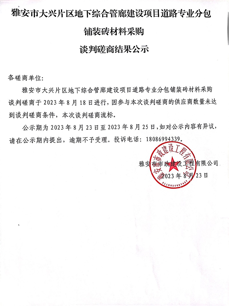 雅安市大興片區(qū)地下綜合管廊建設項目道路專業(yè)分包鋪裝磚材料采購談判磋商結果公示