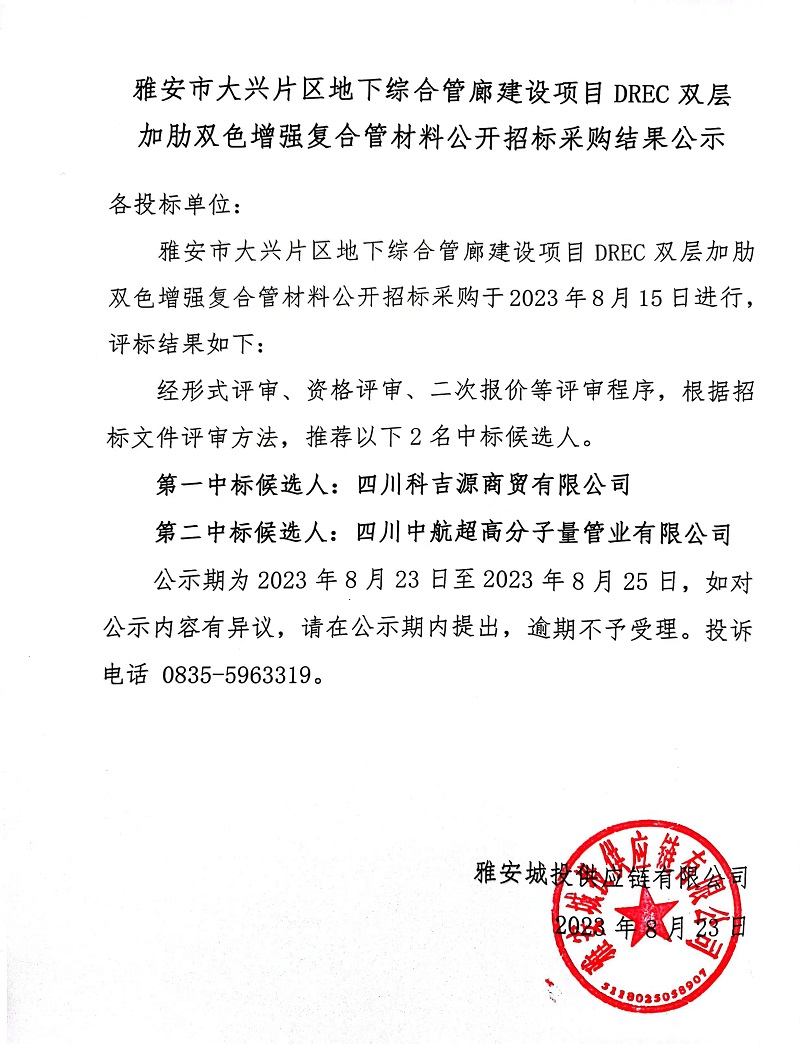 雅安市大興片區(qū)地下綜合管廊建設(shè)項(xiàng)目DREC雙層加肋雙色增強(qiáng)復(fù)合管材料公開招標(biāo)采購(gòu)結(jié)果公示