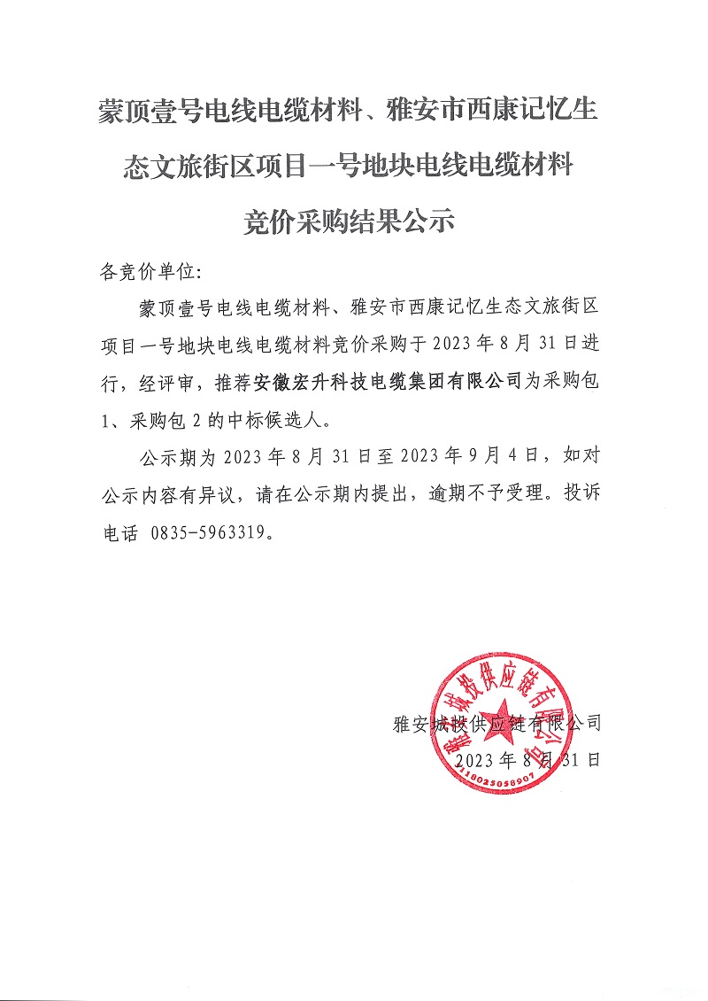 蒙頂壹號(hào)電線電纜材料、雅安市西康記憶生態(tài)文旅街區(qū)項(xiàng)目一號(hào)地塊電線電纜材料競(jìng)價(jià)采購(gòu)結(jié)果公示