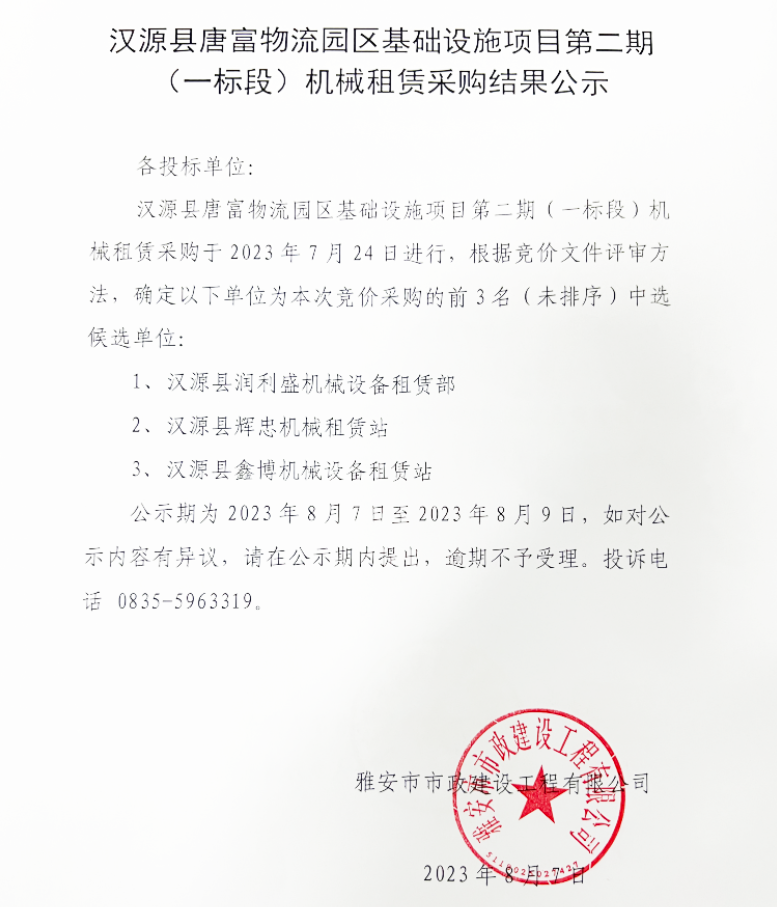 漢源縣唐富物流園區(qū)基礎(chǔ)設(shè)施項目第二期(一標段)機械租賃采購結(jié)果公示