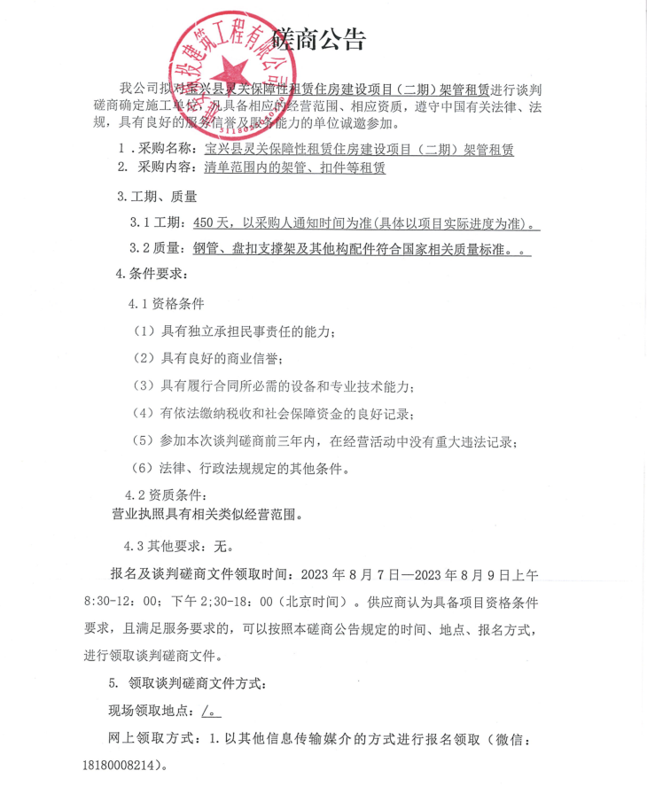 寶興縣靈關保障性租賃住房建設項目(二期)架管租賃談判磋商公告