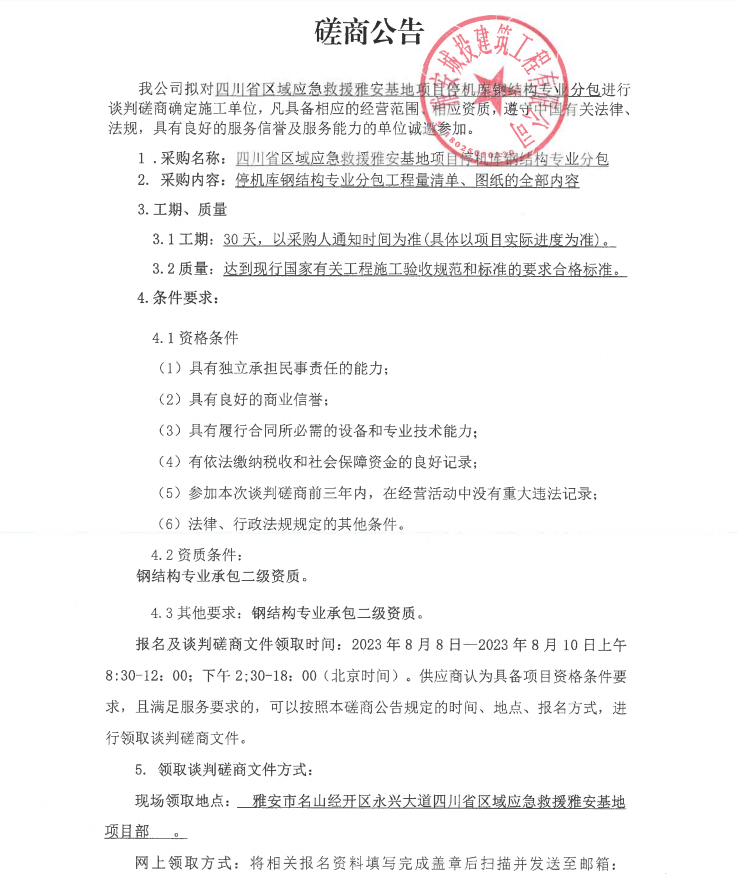 四川省區(qū)域應(yīng)急救援雅安基地項(xiàng)目停機(jī)庫(kù)鋼結(jié)構(gòu)專業(yè)分包談判磋商公告