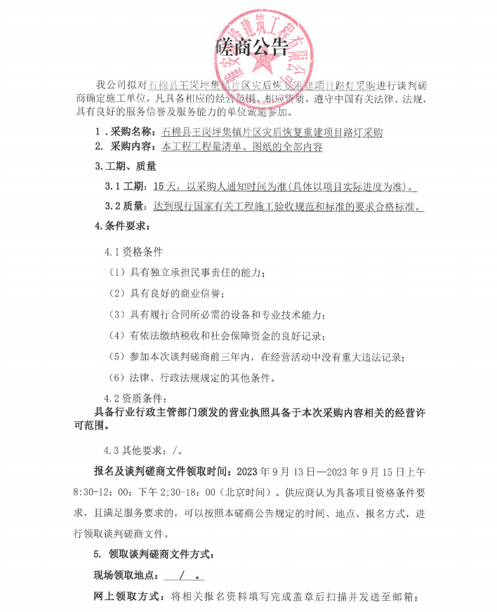 石棉縣王崗坪集鎮(zhèn)片區(qū)災(zāi)后恢復(fù)重建項(xiàng)目路燈采購談判磋商公告