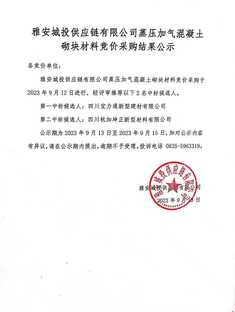 雅安城投供應(yīng)鏈有限公司蒸壓加氣混凝土砌塊材料競(jìng)價(jià)采購(gòu)結(jié)果公示