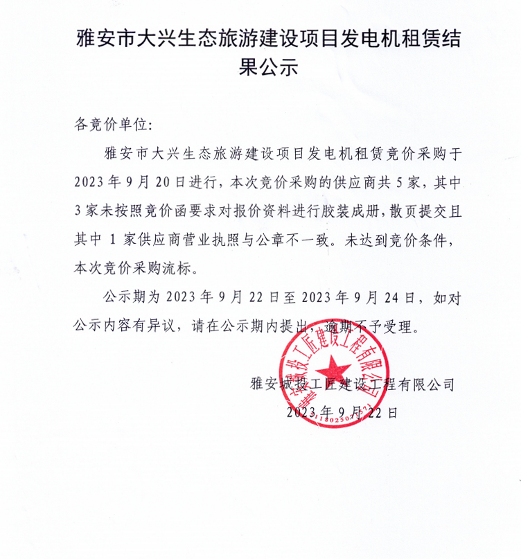 雅安市大興生態(tài)旅游建設(shè)項(xiàng)目發(fā)電機(jī)租賃結(jié)果公示