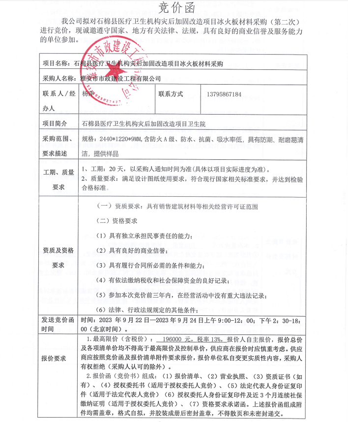 石棉縣醫(yī)療衛(wèi)生機構(gòu)災(zāi)后加固改造項目冰火板材料采購(第二次)競價公告