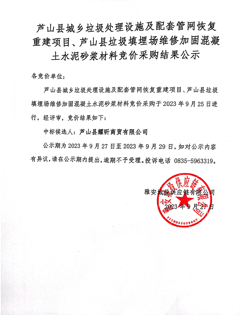 蘆山縣城鄉(xiāng)垃圾處理設(shè)施及配套管網(wǎng)恢復(fù)重建項(xiàng)目、蘆山縣垃圾填埋場維修加固混凝土水泥砂漿材料競價(jià)采購結(jié)果公示