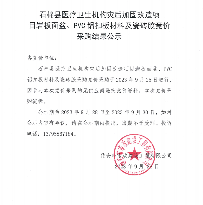 石棉縣醫(yī)療衛(wèi)生機構(gòu)災(zāi)后加固改造項目巖板面盆、PVC鋁扣板材料及瓷磚膠競價采購結(jié)果公示
