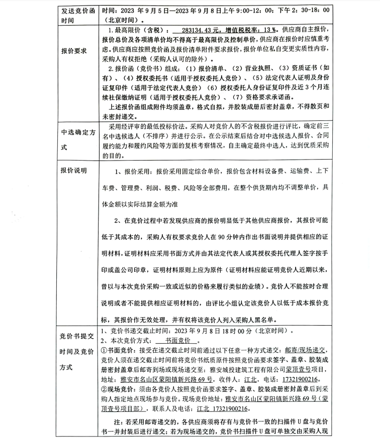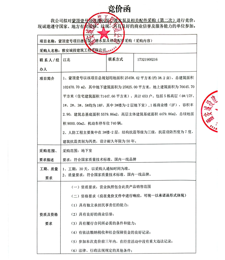 蒙頂壹號項目潛污泵、潛水泵及相關配件采購(第二次)競價公告
