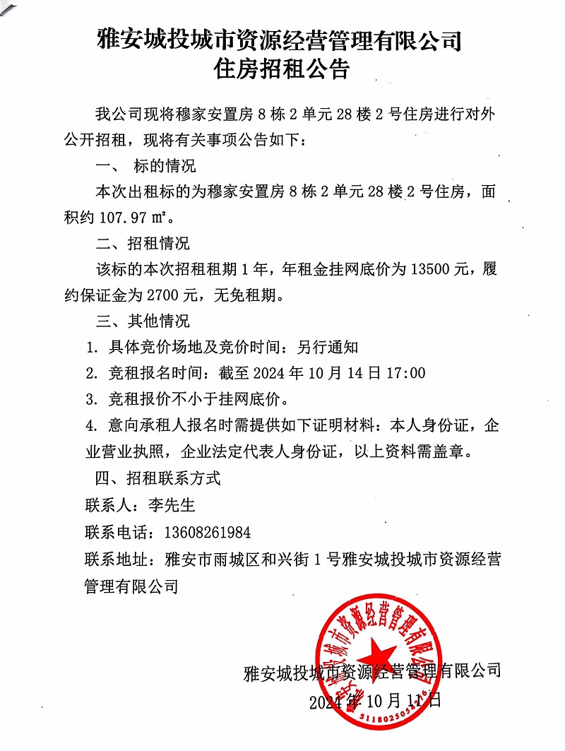 雅安城投城市資源經(jīng)營(yíng)管理有限公司關(guān)于穆家安置房8棟2單元28樓2號(hào)住房招租公告