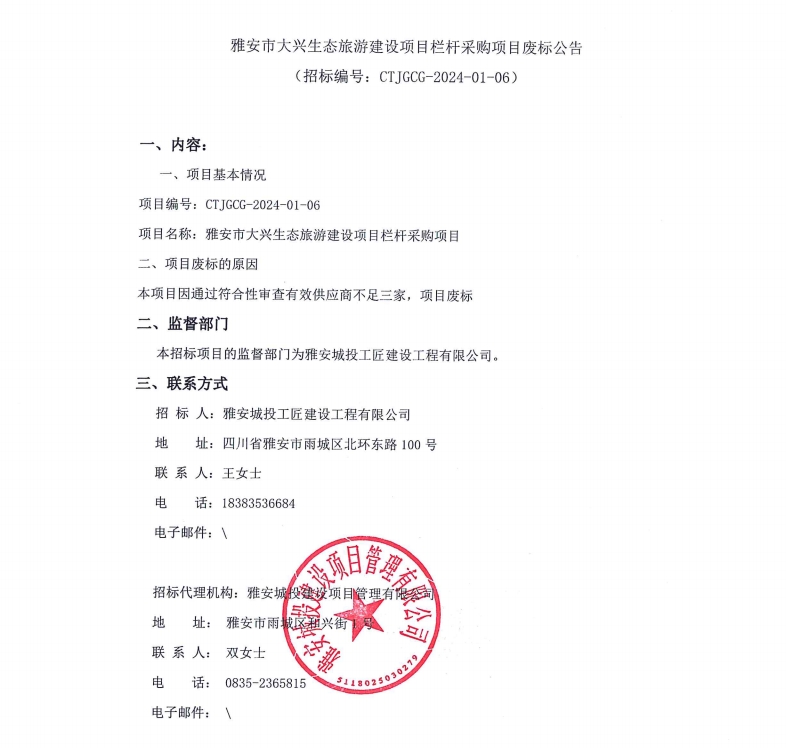 雅安市大興生態(tài)旅游建設(shè)項(xiàng)目欄桿采購(gòu)項(xiàng)目廢標(biāo)公告