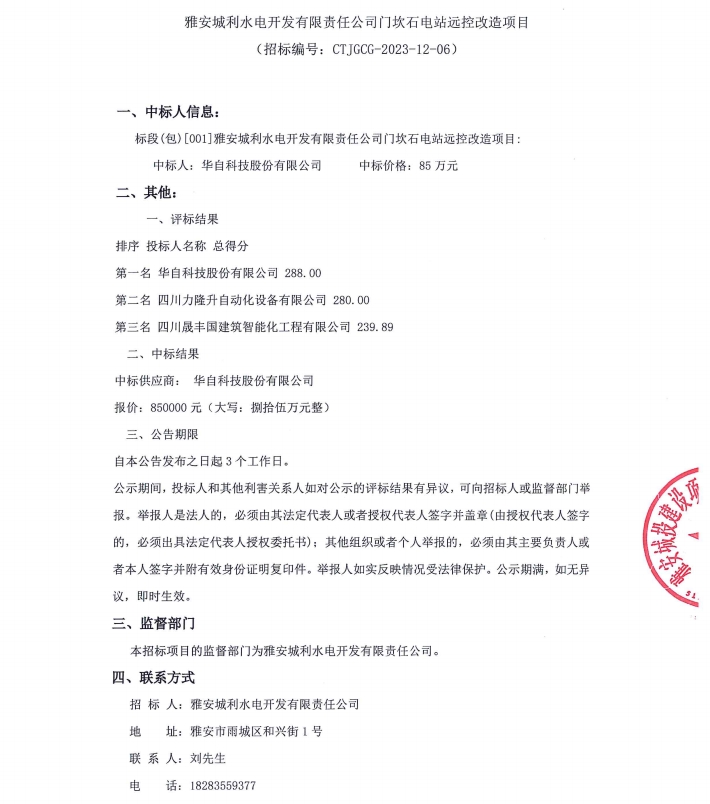 雅安城利水電開發(fā)有限責(zé)任公司門坎石電站遠(yuǎn)控改造項(xiàng)目結(jié)果公示