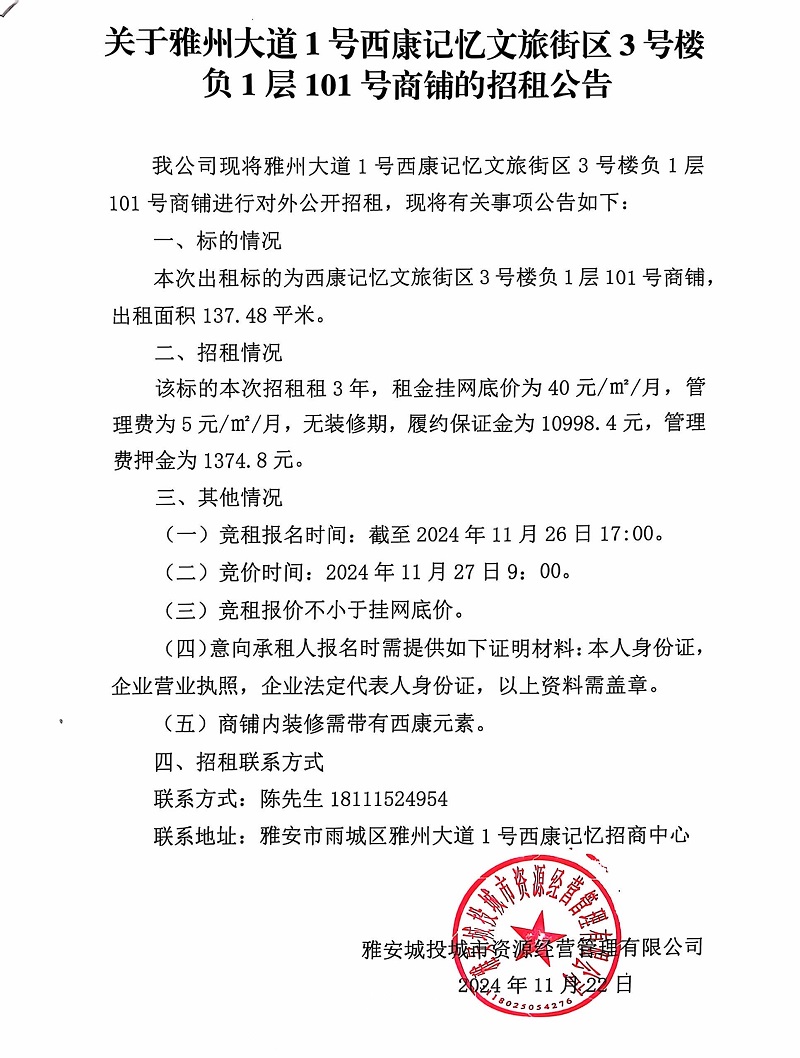 關(guān)于雅州大道1號(hào)西康記憶文旅街區(qū)3號(hào)樓負(fù)1層101號(hào)商鋪的招租公告