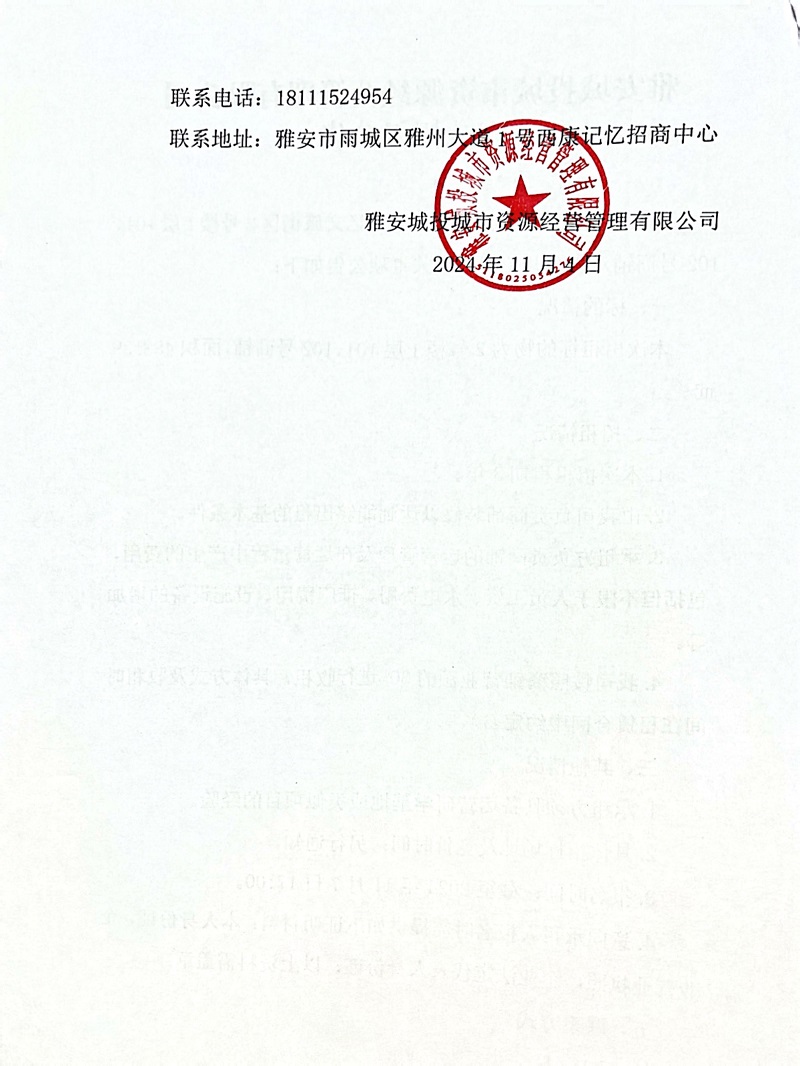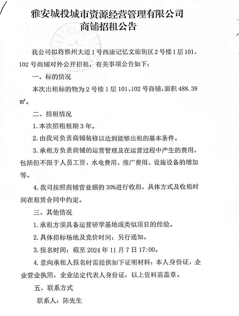 雅安城投城市資源經營管理有限公司雅州大道1號西康記憶文旅街區(qū)2號樓1層101、102號商鋪招租的公告