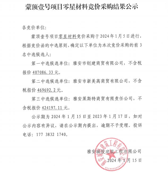 蒙頂壹號項目零星材料競價采購結果公示
