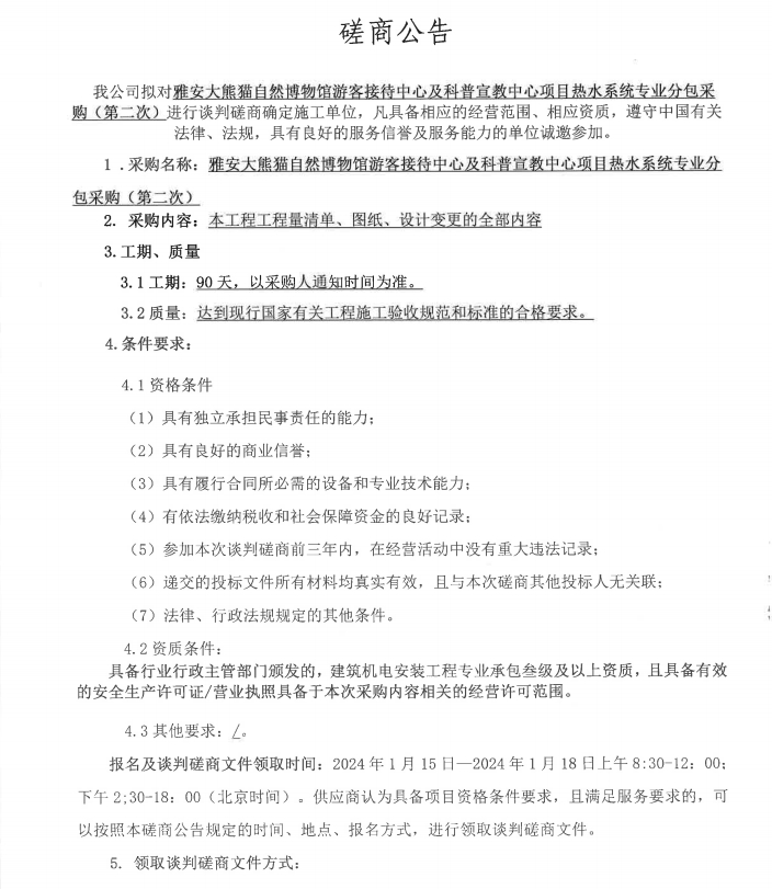 雅安大熊貓自然博物館游客接待中心及科普宣教中心項(xiàng)目熱水系統(tǒng)專業(yè)分包采購(gòu)(第二次)磋商公告