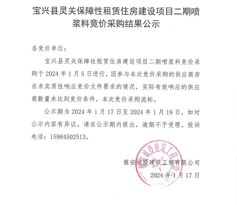 寶興縣靈關(guān)保障性租賃住房建設(shè)項(xiàng)目二期噴漿料競價(jià)采購結(jié)果公示