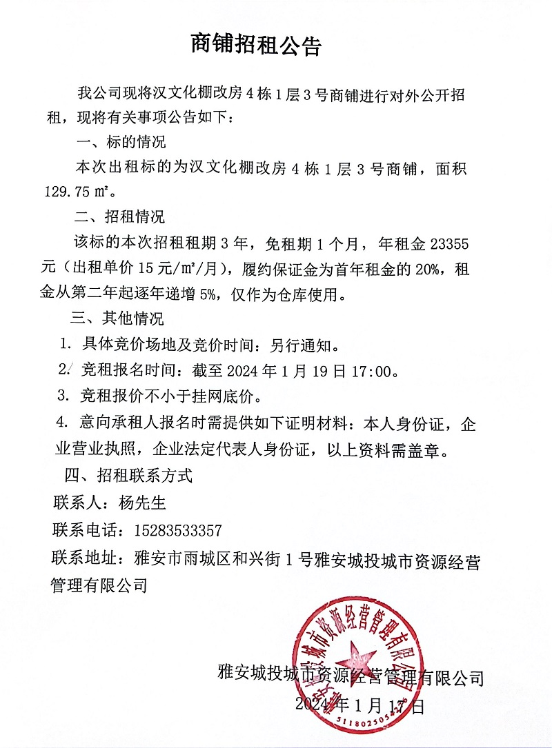 漢文化棚改房4棟1層3號(hào)商鋪招租公告