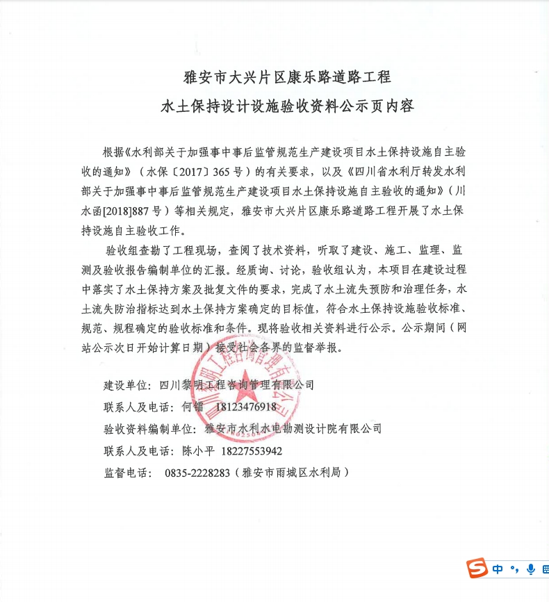 雅安市大興片區(qū)康樂路道路工程水土保持設(shè)計設(shè)施驗收資料公示頁內(nèi)容