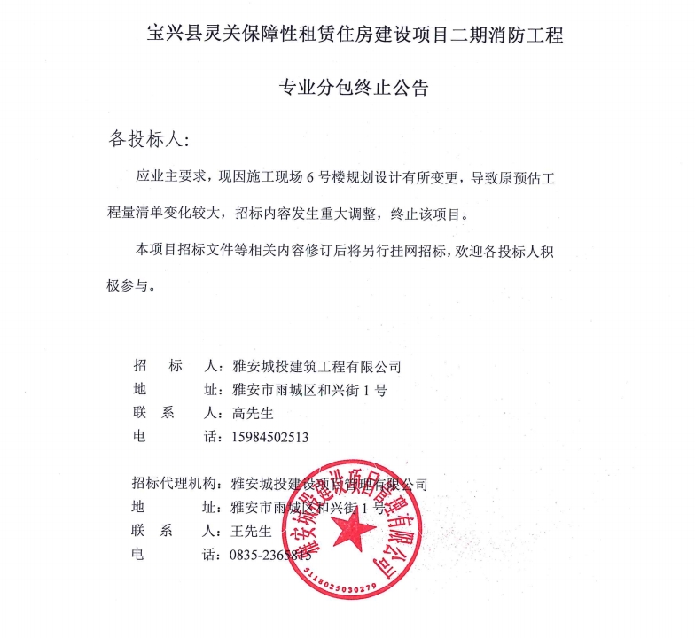 寶興縣靈關(guān)保障性租賃住房建設(shè)項目二期消防工程專業(yè)分包終止公告