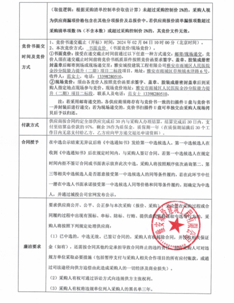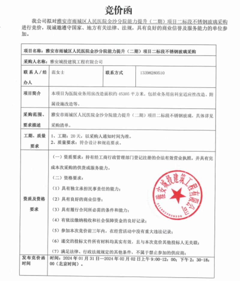 雅安市雨城區(qū)人民醫(yī)院金沙分院能力提升(二期)項目二標段不銹鋼玻璃采購競價公告