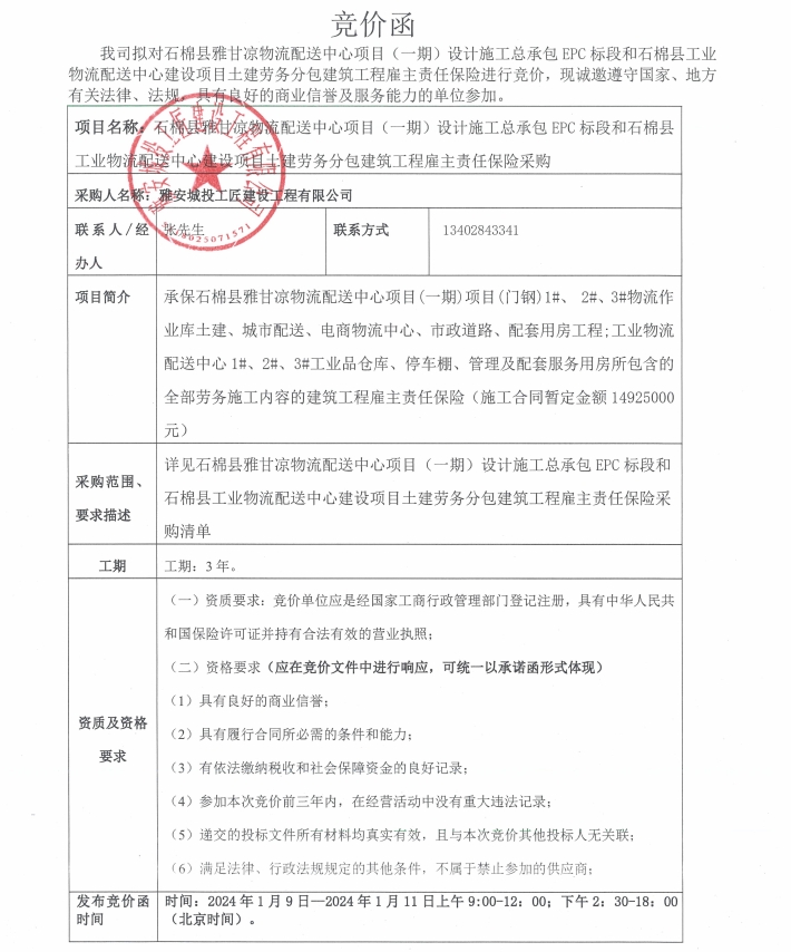 石棉縣雅甘涼物流配送中心項(xiàng)目(一期)設(shè)計(jì)施工總承包EPC標(biāo)段和石棉縣工業(yè)物流配送中心建設(shè)項(xiàng)目土建勞務(wù)分包建筑工程雇主責(zé)任保險采購競價公告