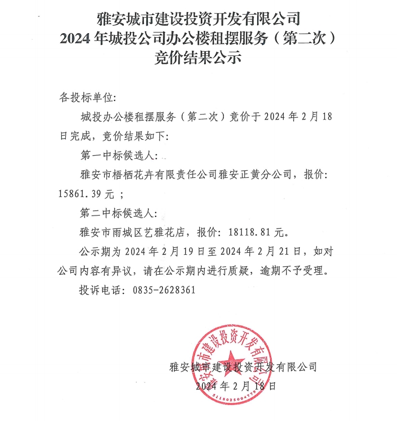 雅安城市建設(shè)投資開(kāi)發(fā)有限公司2024年城投公司辦公樓租擺服務(wù)(第二次)競(jìng)價(jià)結(jié)果公示