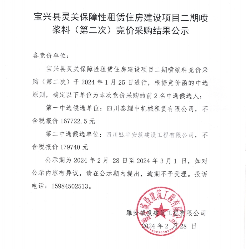 寶興縣靈關(guān)保障性租賃住房建設(shè)項(xiàng)目二期噴漿料(第二次)競(jìng)價(jià)采購(gòu)結(jié)果公示