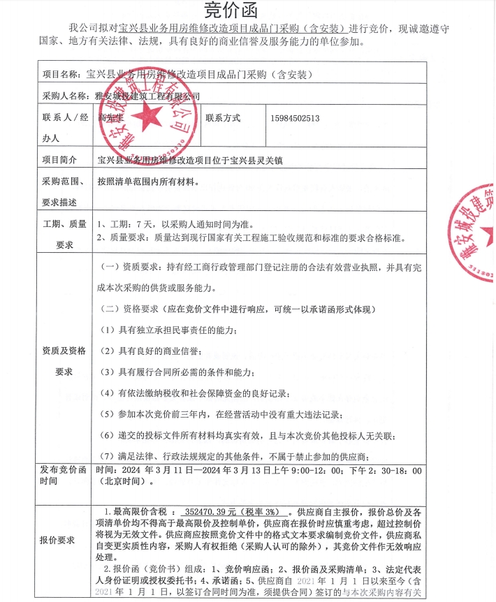 寶興縣業(yè)務用房維修改造項目成品門采購(含安裝)競價公告