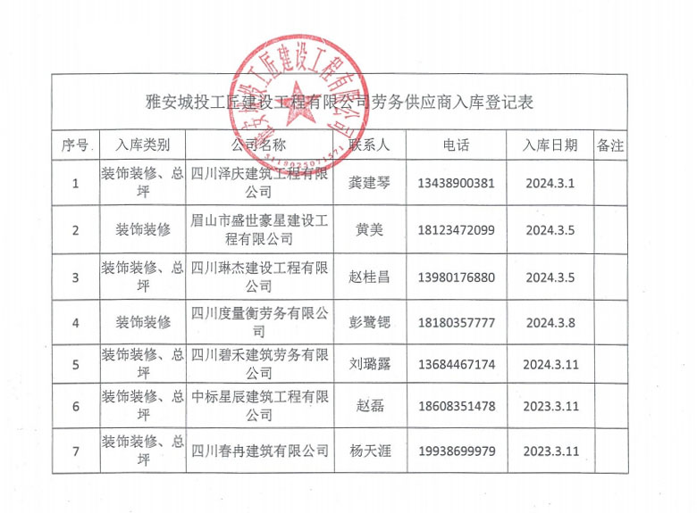 雅安城投工匠建設(shè)有限公司勞務(wù)供應(yīng)商入庫登記公示