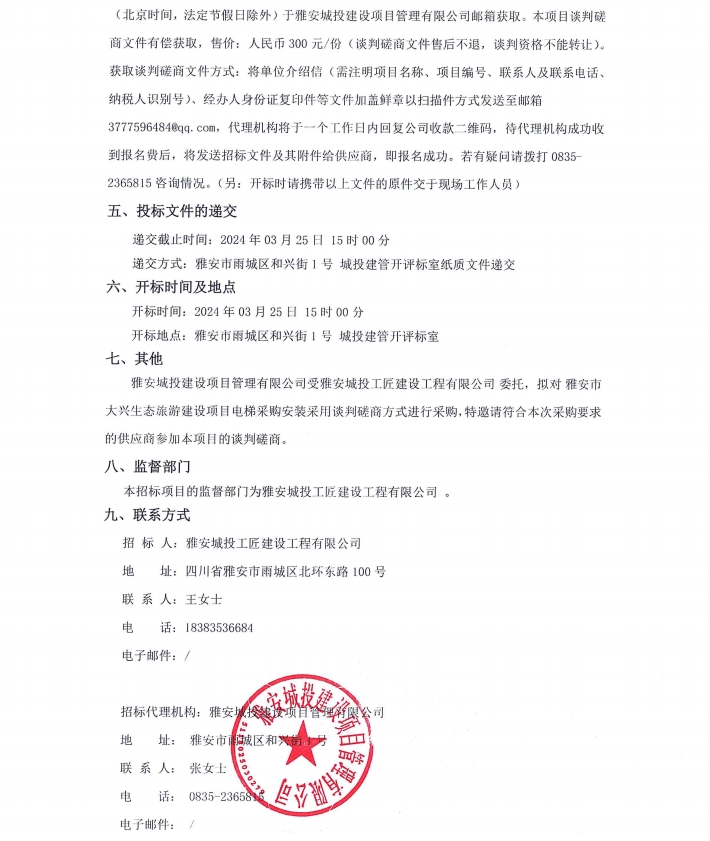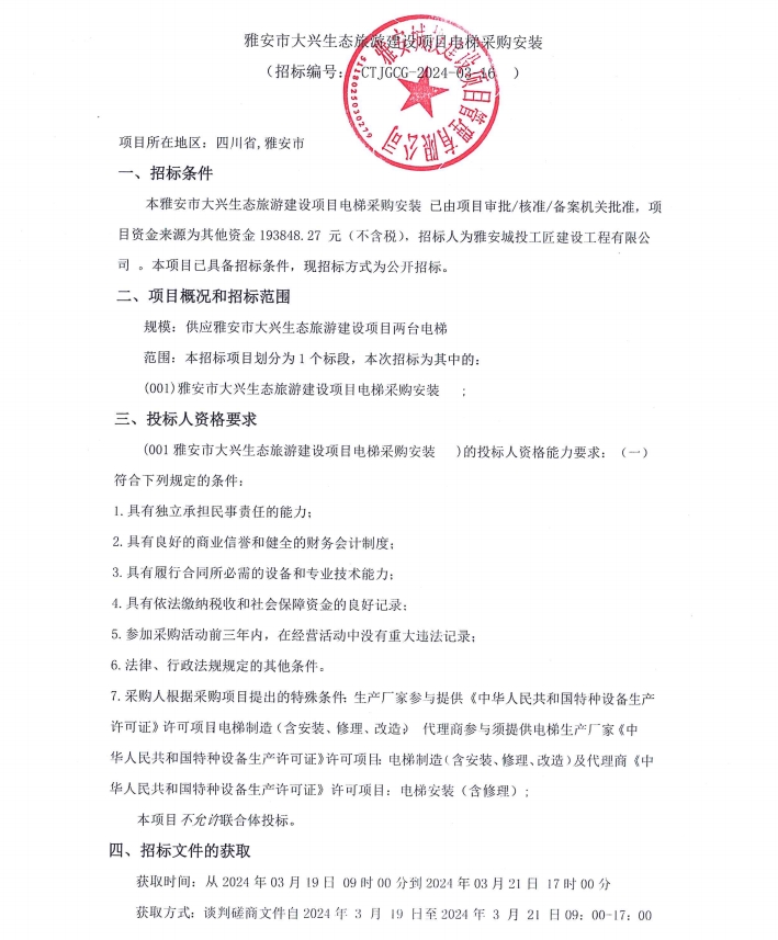 雅安市大興生態(tài)旅游建設(shè)項(xiàng)目電梯采購安裝公告
