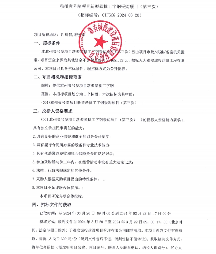 雅州壹號(hào)院項(xiàng)目新型懸挑工字鋼采購(第三次)公告
