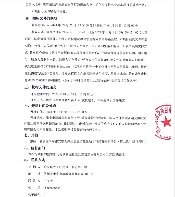 雅安市大興生態(tài)旅游建設(shè)項(xiàng)目花崗石采購(gòu)項(xiàng)目(第二次)公告