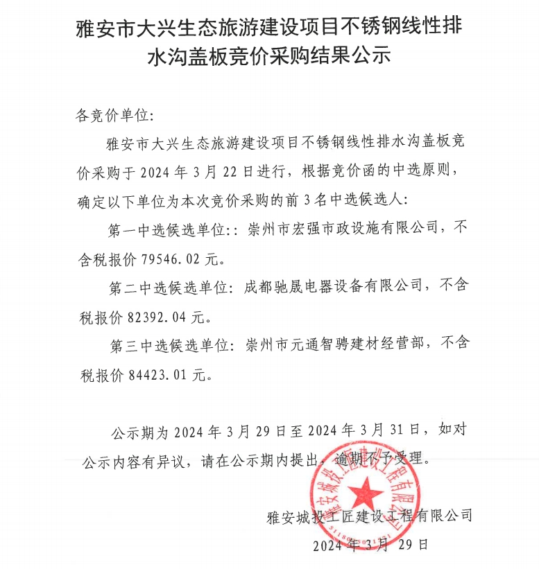 雅安市大興生態(tài)旅游建設(shè)項(xiàng)目不銹鋼線(xiàn)性排水溝蓋板競(jìng)價(jià)采購(gòu)結(jié)果公示