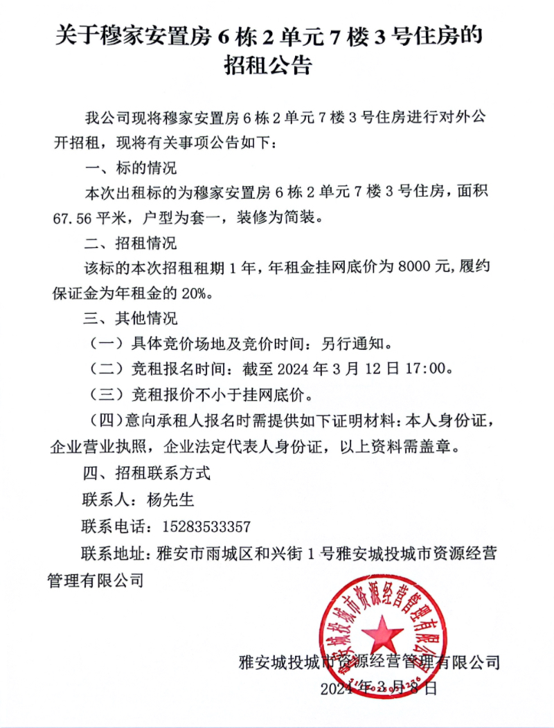 關(guān)于穆家安置房6棟2單元7樓3號住房的招租公告