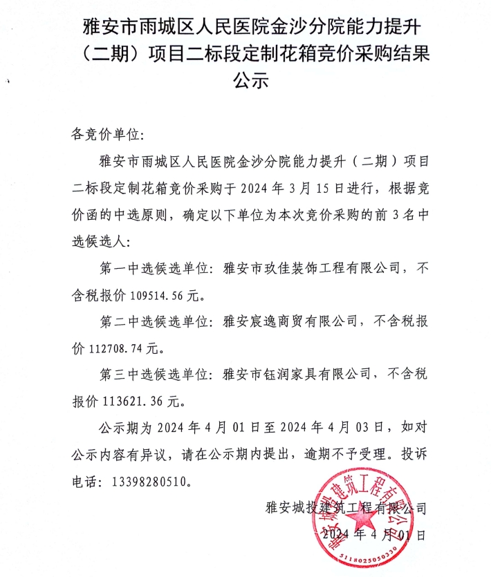 雅安市雨城區(qū)人民醫(yī)院金沙分院能力提升(二期)項目二標(biāo)段定制花箱競價采購結(jié)果公示