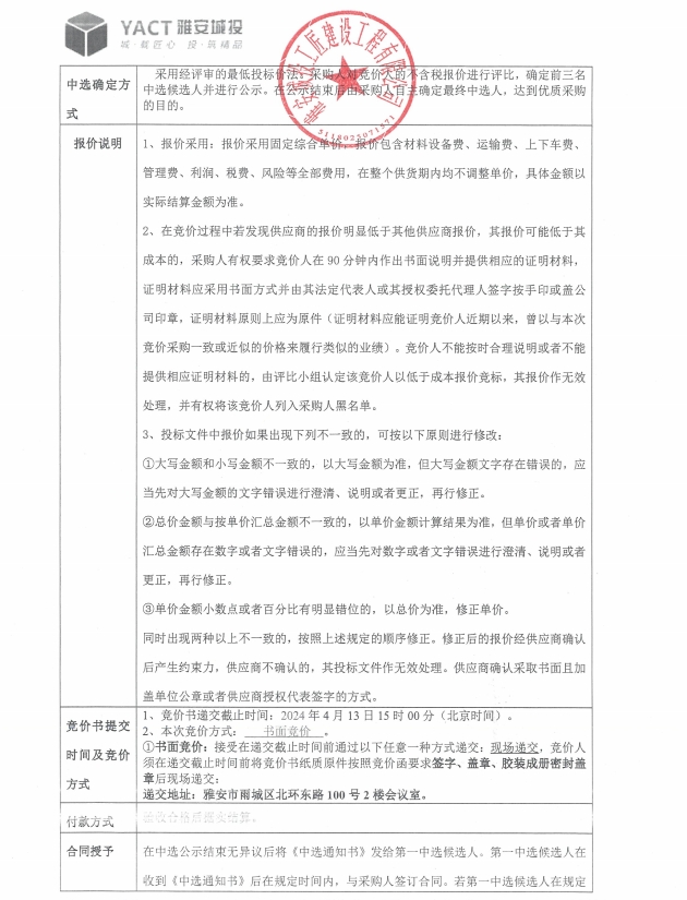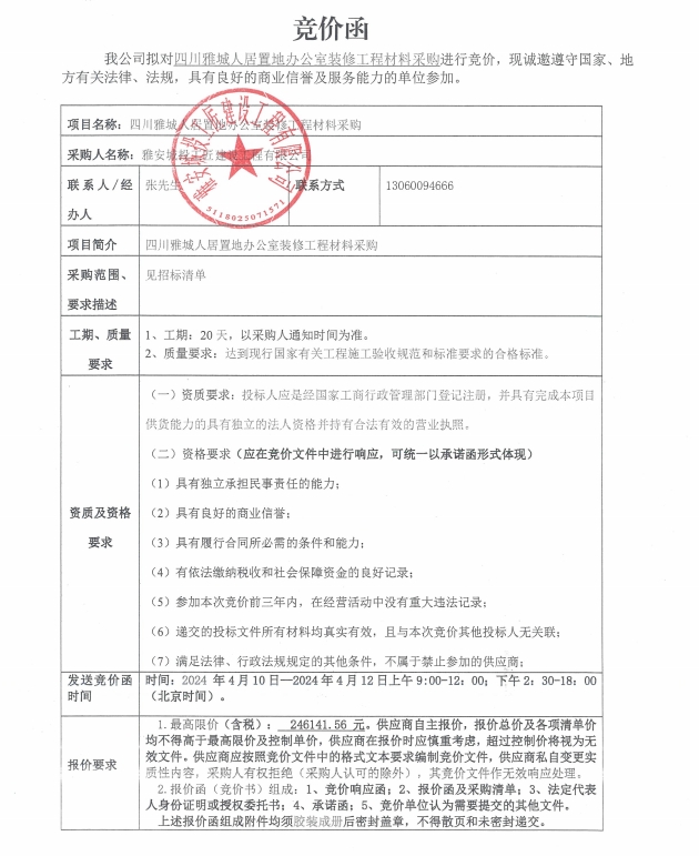 四川雅城人居置地辦公室裝修工程材料采購競價公告
