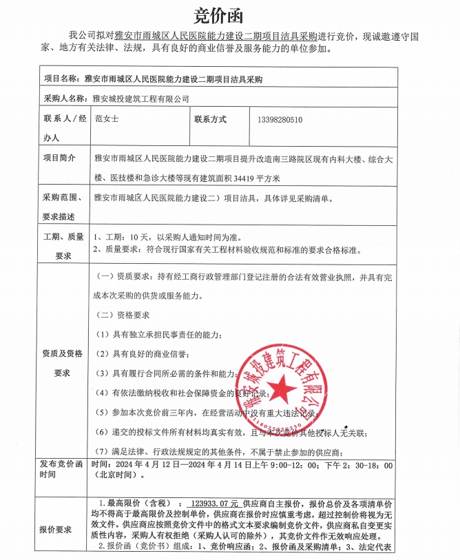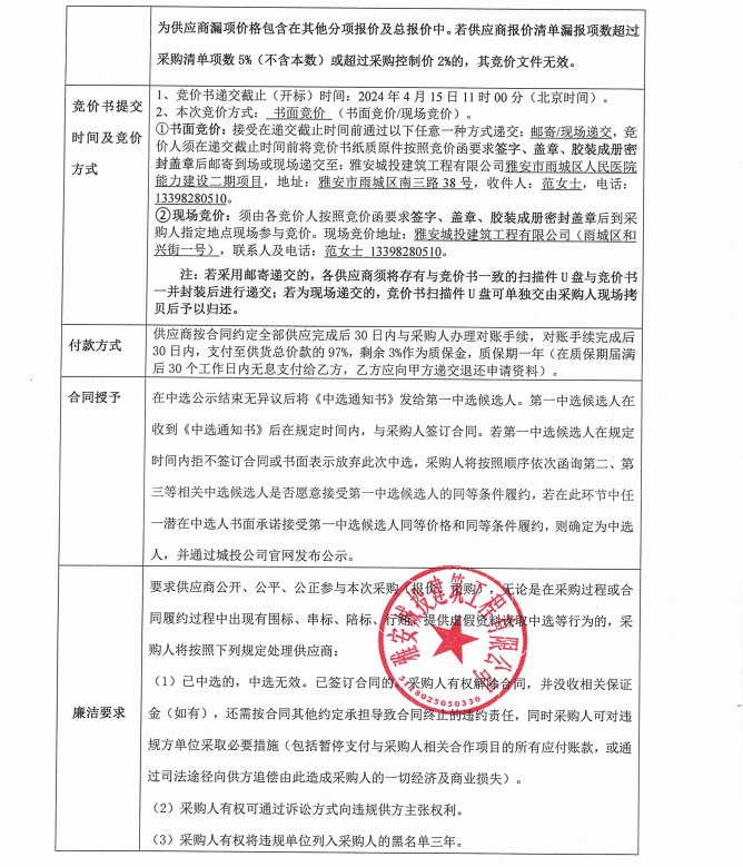 雅安市雨城區(qū)人民醫(yī)院能力建設二期項目潔具采購競價公告