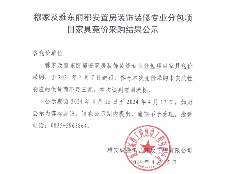 穆家及雅東麗都安置房裝飾裝修專業(yè)分包項(xiàng)目家具競價采購結(jié)果公示
