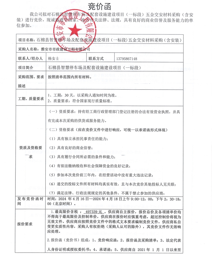 石棉縣智慧停車場及配套設(shè)施建設(shè)項目(一標(biāo)段)五金交安材料(含安裝)競價公告