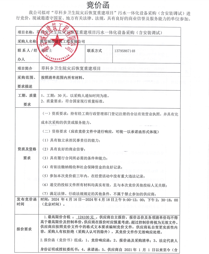 草科鄉(xiāng)衛(wèi)生院災(zāi)后恢復(fù)重建項(xiàng)目污水一體化設(shè)備采購(含安裝調(diào)試)競價(jià)公告