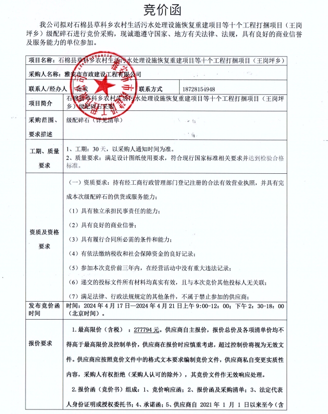 石棉縣草科鄉(xiāng)農(nóng)村生活污水處理設(shè)施恢復(fù)重建項目等十個工程打捆項目(王崗坪鄉(xiāng))級配碎石競價公告