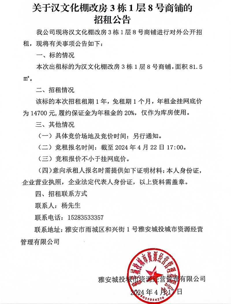 關(guān)于漢文化棚改房3棟1層8號(hào)商鋪的招租公告
