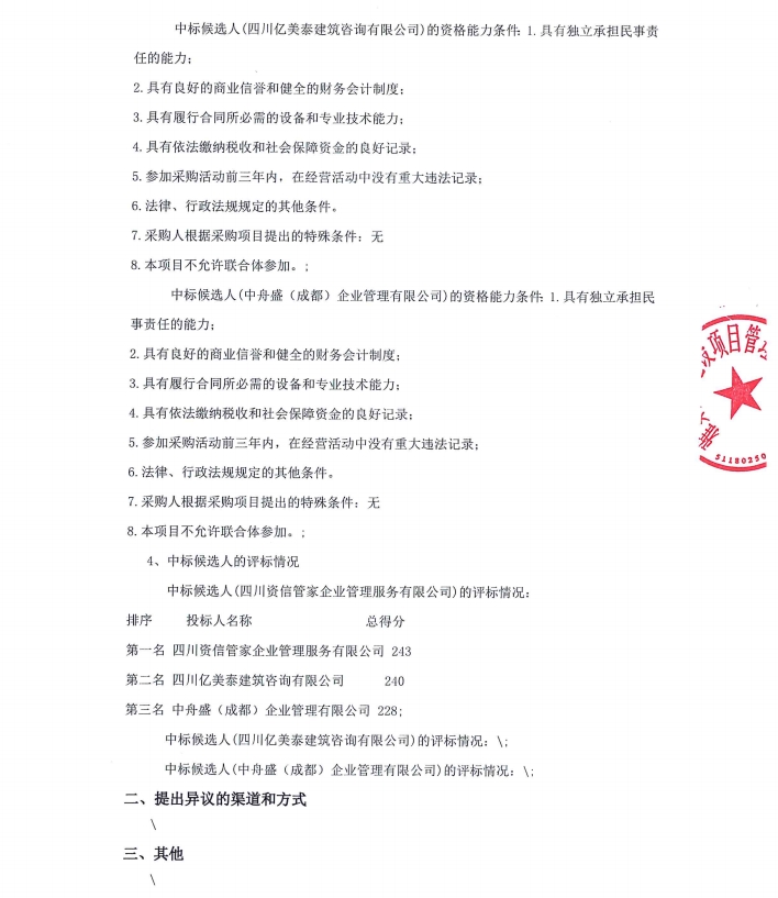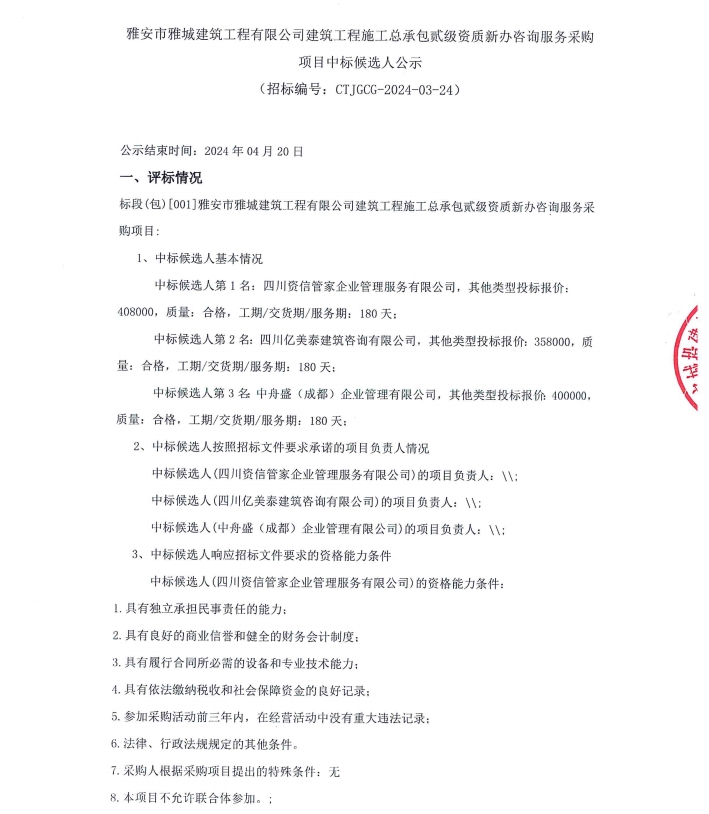 雅安市雅城建筑工程有限公司建筑工程施工總承包貳級資質新辦咨詢服務采購項目中標候選人公示