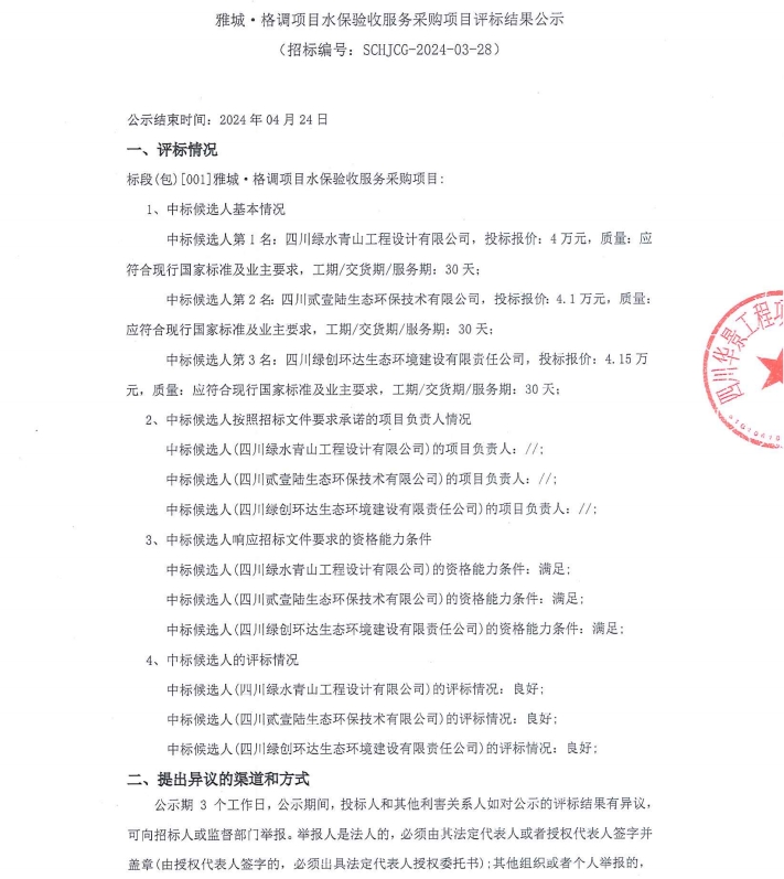 雅城·格調(diào)項目水保驗收服務(wù)采購項目評標結(jié)果公示