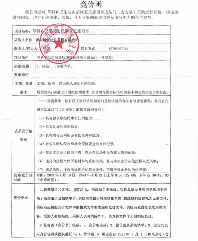 草科鄉(xiāng)衛(wèi)生院災(zāi)后恢復(fù)重建項(xiàng)目成品門(mén)(含安裝)采購(gòu)競(jìng)價(jià)公告