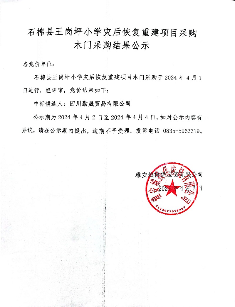 石棉縣王崗坪小學(xué)災(zāi)后恢復(fù)重建項(xiàng)目采購(gòu)木門采購(gòu)結(jié)果公示