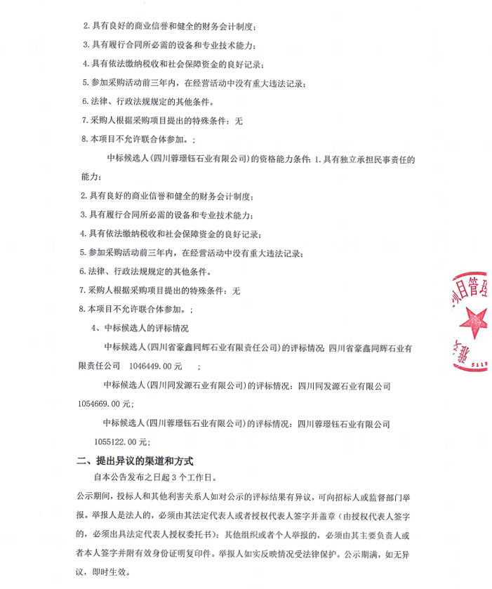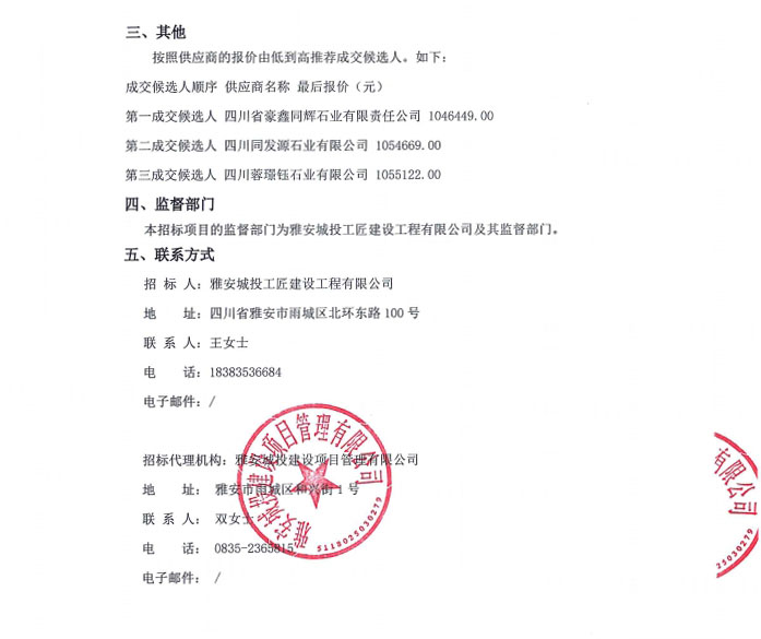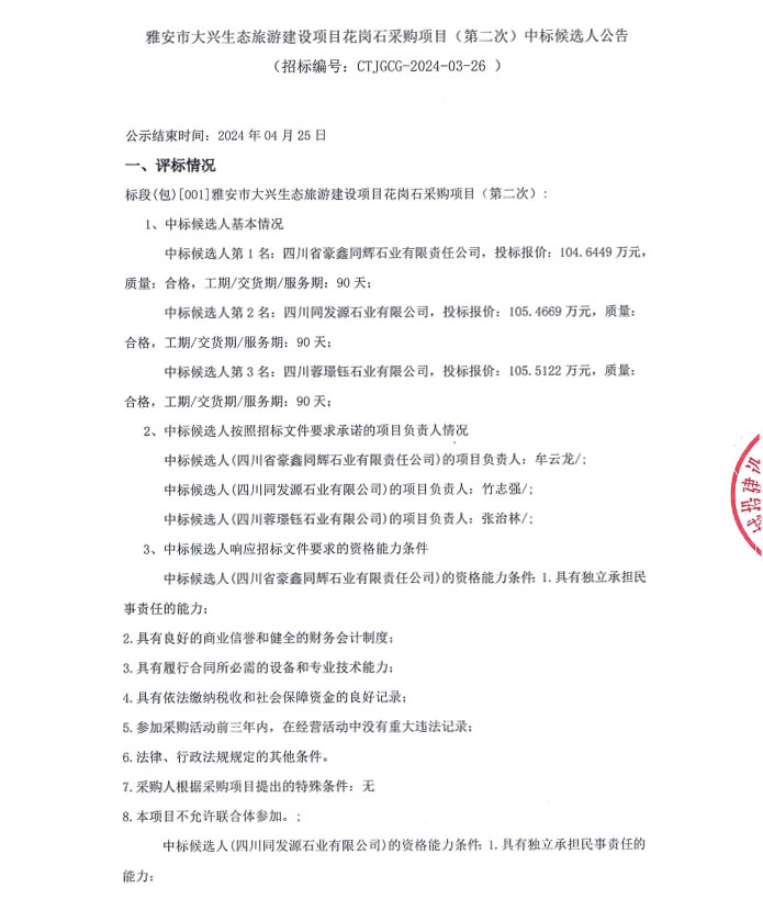 雅安市大興生態(tài)旅游建設(shè)項目花崗石采購項目(第二次)中標(biāo)候選人公告