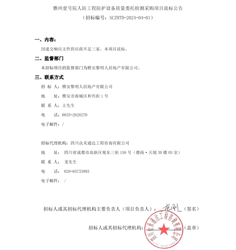 雅州壹號院人防工程防護設(shè)備質(zhì)量委托檢測采購項目流標公告